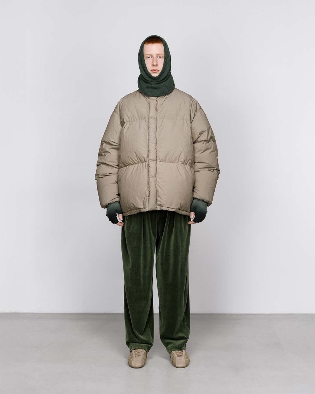 A down-filled stand collar jacket with a wide, voluminous fit and press stud concealed front with zipper.