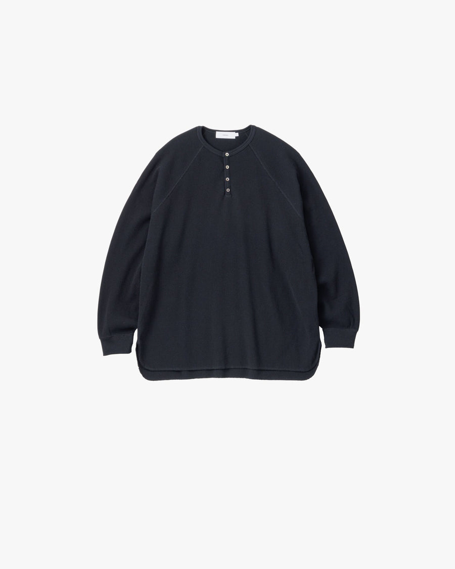 A relaxed-fit long-sleeve Henley neck T-shirt designed to create a clean neckline.